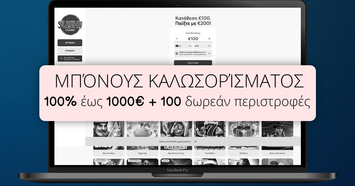 - Μπόνους χωρίς κατάθεση: 20 free spins με κωδικό SUSHI20.